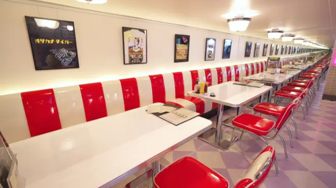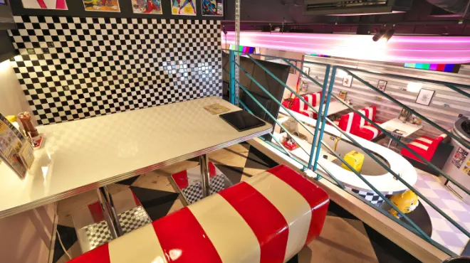 1950年代のアメリカンダイナーをイメージして作られた店内。 オールドアメリカンな雰囲気に浸りながら、ハンバーガーや肉厚ステーキなどの アメリカンスタイルな料理をご提供いたします。 まるで「アメリカにいる」かのような錯覚をさせる空間となっております。